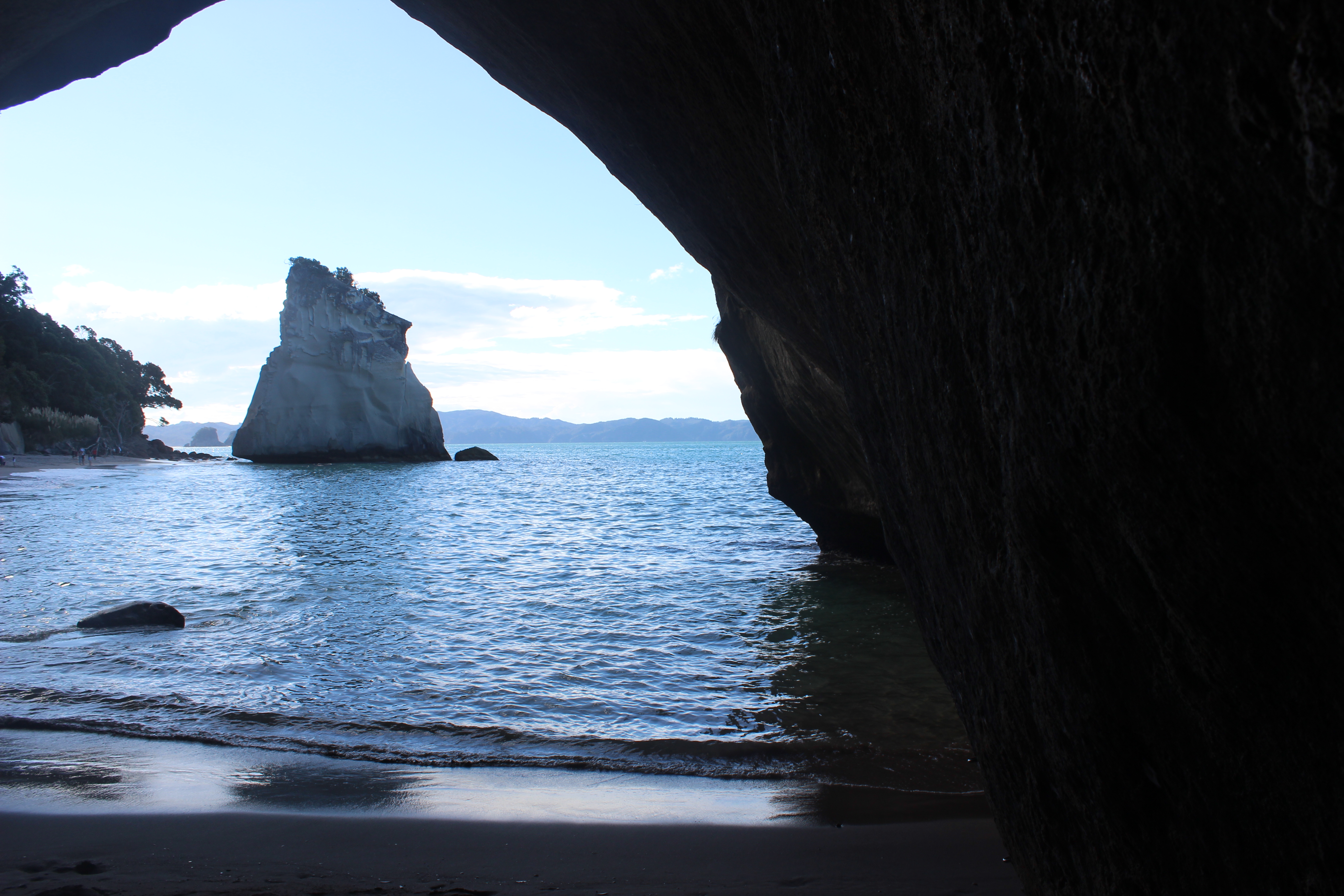 As we got further from Auckland, the road became a windy mess through pastures filled with fluffy sheep and massive cows. Our first destination was Cathedral Cove which is a beautiful white sand beach overshadowed by a massive stone arch, shaped very much like the inside of a cathedral. We got down to the beach as the sun was dipping behind the seaside cliffs, so after taking in the incredible views we made the hike back to the car before it got to cold. We drove to our 1st campground and cooked dinner in the back of the van, watching the sunset behind the mountains to the west.