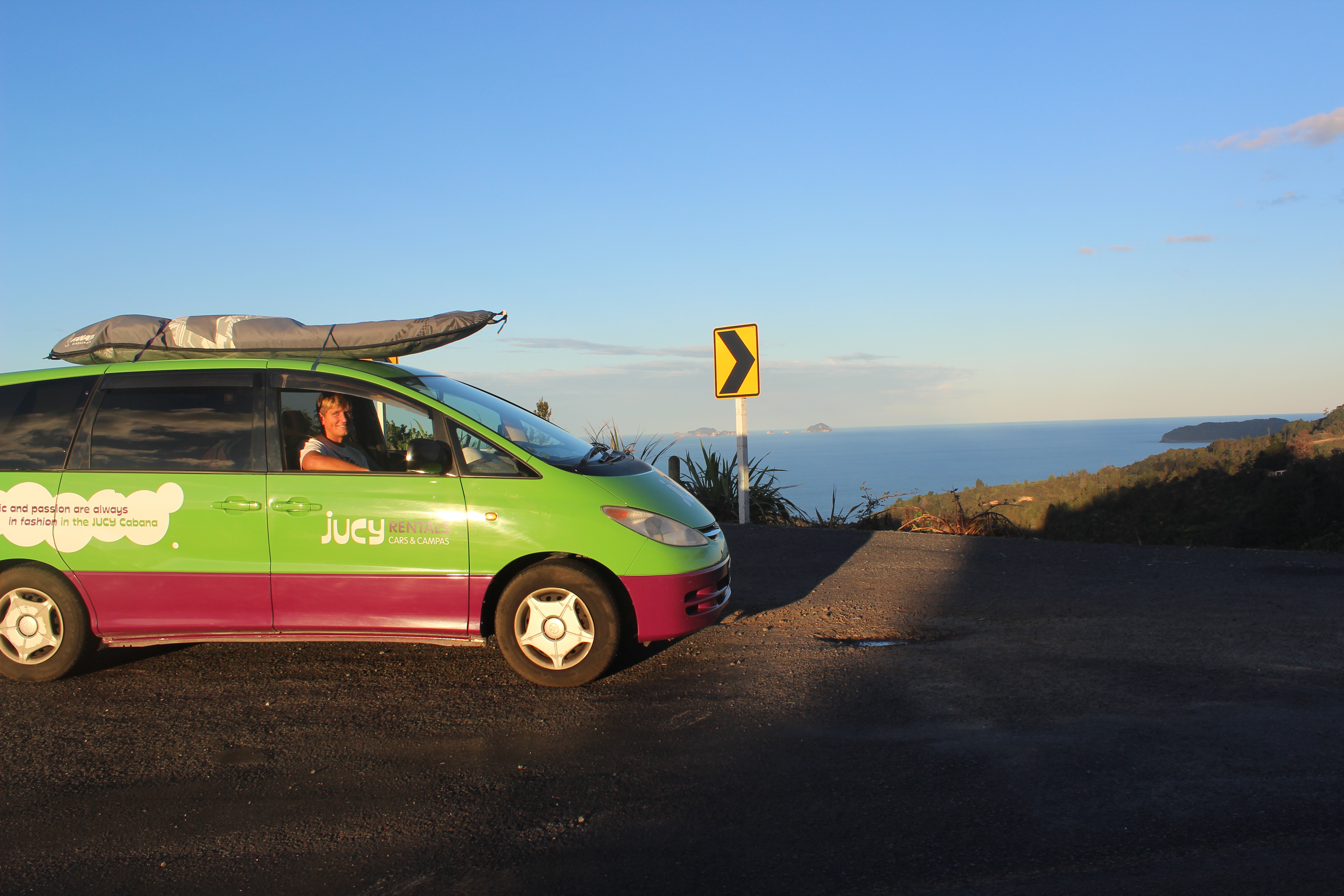 Our Kiwi friends, Sean and Kirsty, dropped us off near the airport at the Jucy rental company to pick up our new home for the next 10 days. We got our bright purple and green campervan, which was really a converted Toyota Estima Mini-Van, and went straight to the grocery store to stock up on supplies. After grabbing the essentials we put Auckland in the rearview mirror as we headed west towards the Corromandel Peninsula. At the beginning I had to constantly remind myself to stick to the left hand side of the road and to always look right first when pulling out. As easy as it sounds, it’s actually fairly confusing when, instead of traffic lights, most intersections are divided my massive roundabouts.